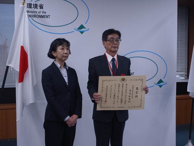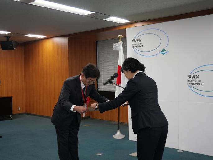 表彰式は、令和7年11月5日(水)14時から環境省第一会議室(中央合同庁舎5号館22階)にて催され、環境省 水・大気環境局の大森恵子局長から、表彰状の伝達を受けました。当日は、船坂鐐三氏はあいにく都合が付きませんでしたが、青木隆生氏がご出席のうえ受賞されました。